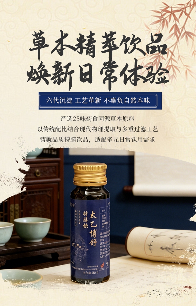 公司深耕草本饮品领域,传承六代中医世家的草本智慧,坚守“药食同源,以人为本”的核心主张,将草本经验与现代生活需求相结合,打造出太乙博舒特膳饮,依托食字号资质认证与 PICC 产品责任险承保,为产品质量提供双重保障,致力于让更多家庭能够享用到安心可靠的草本饮品,让草本风味融入日常生活,成为大众日常饮用的可靠伙伴